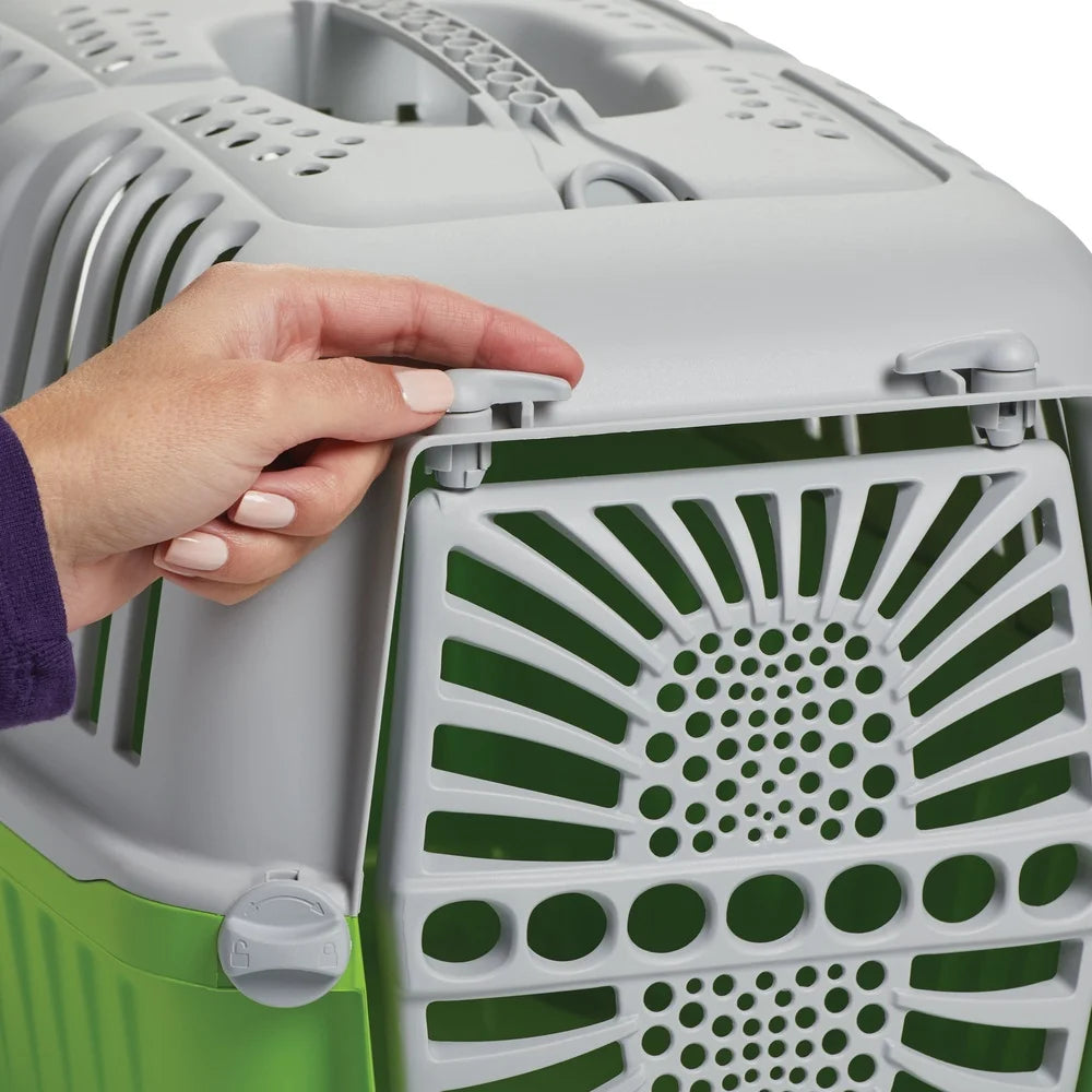 This 22-inch carrier is i for extra small cats, "Small" dog breeds, and other small animals such as ferrets and birds. Designed for convenience, the Spree pet carrier assembles quickly without the need for tools, making it the perfect choice for short ts to the dog park, pet store, or veterinarian. Each carrier features a secure, user-friendly plastic door that opens in both directions, along with a built-in carrying handle for effortless transport. With dimensions of 18. 90L x 12. 21W x 12. 72H inches and a doorway size of 7. 16W x 7. 63H inches, this carrier is crafted from durable, easy-to-clean plastic, ensuring your pet enjoys proper ventilation and visibility. This specific model is the Green 22-inch Spree pet carrier with a plastic door; if you prefer a metal door, please check out our original spree model #1422SPB.